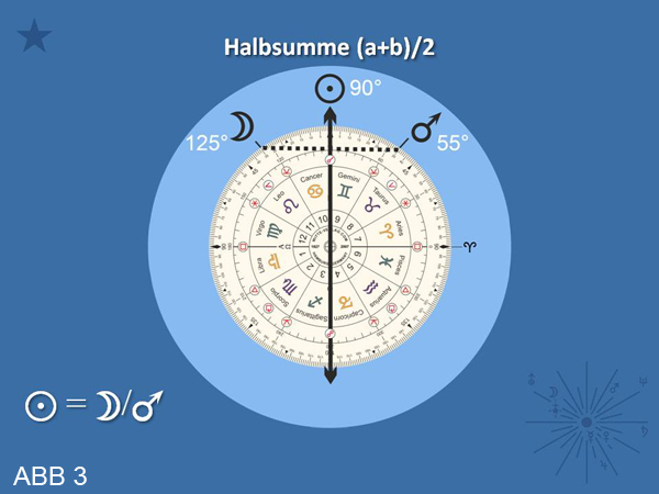Auf diesem Bild ist die Untersuchungsachse auf Sonne gestellt, die auf 0° Krebs steht (90°). Die Faktoren Mond und Mars stehen sich gegenüber und haben jeweils den gleichen Winkel von 35° zur Achse. Der rechnerische Nachweis der Halbsummengleichung als symmetrische Struktur sieht so aus: